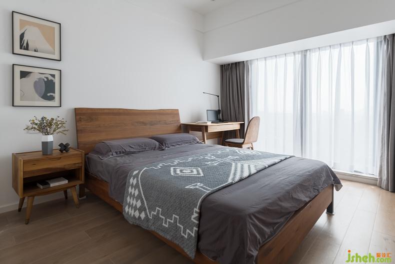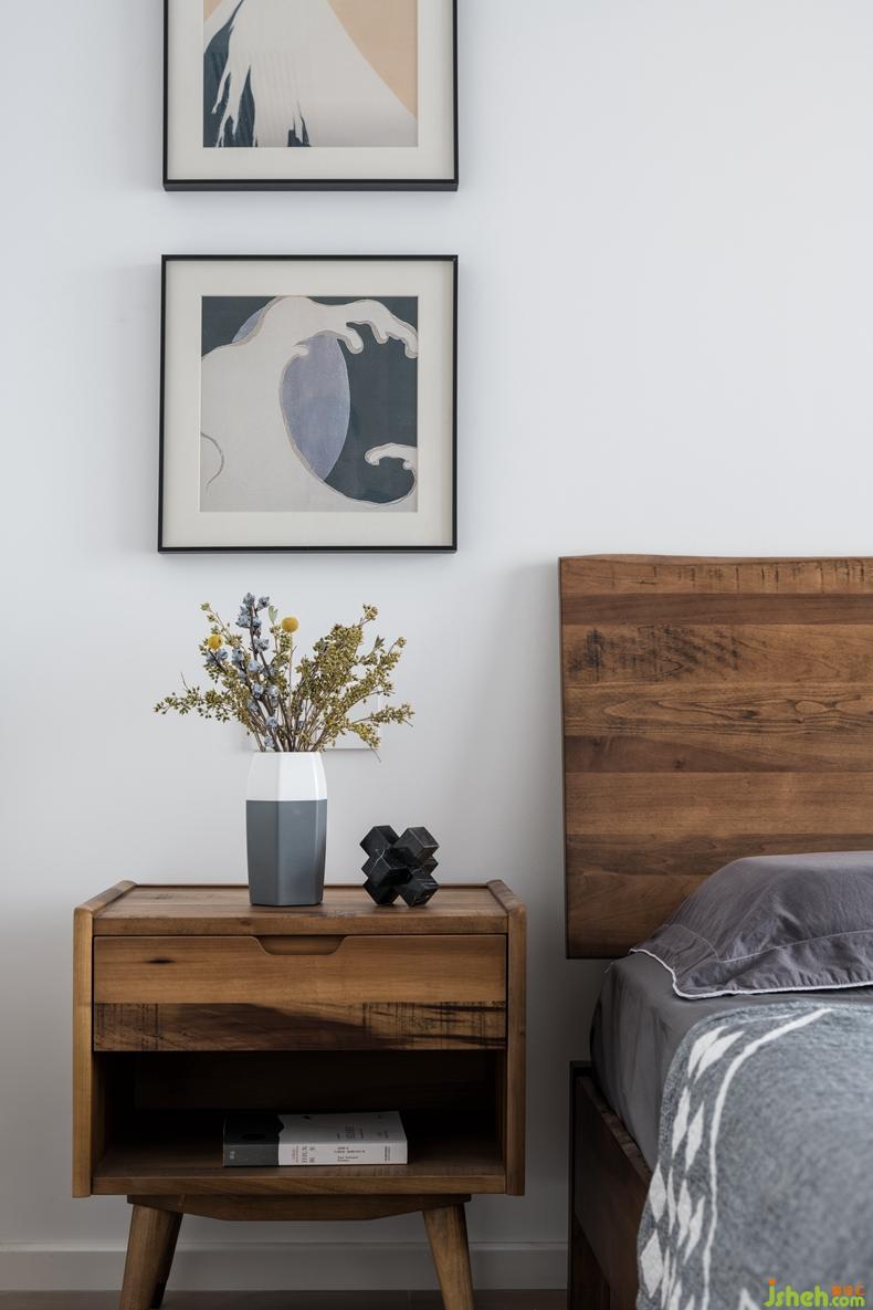 一般情况下,壁画的悬挂位置于床头正中间对应的墙壁上。但设计师为了使空间达到视觉上的均衡,结合了书桌与倒凸窗的距离,在床头柜的上方悬挂了两幅精心挑选的小壁画持恒。壁画框采用黑色包边在突显质感的同时对空间的整体效果上也起到了沉淀的作用。