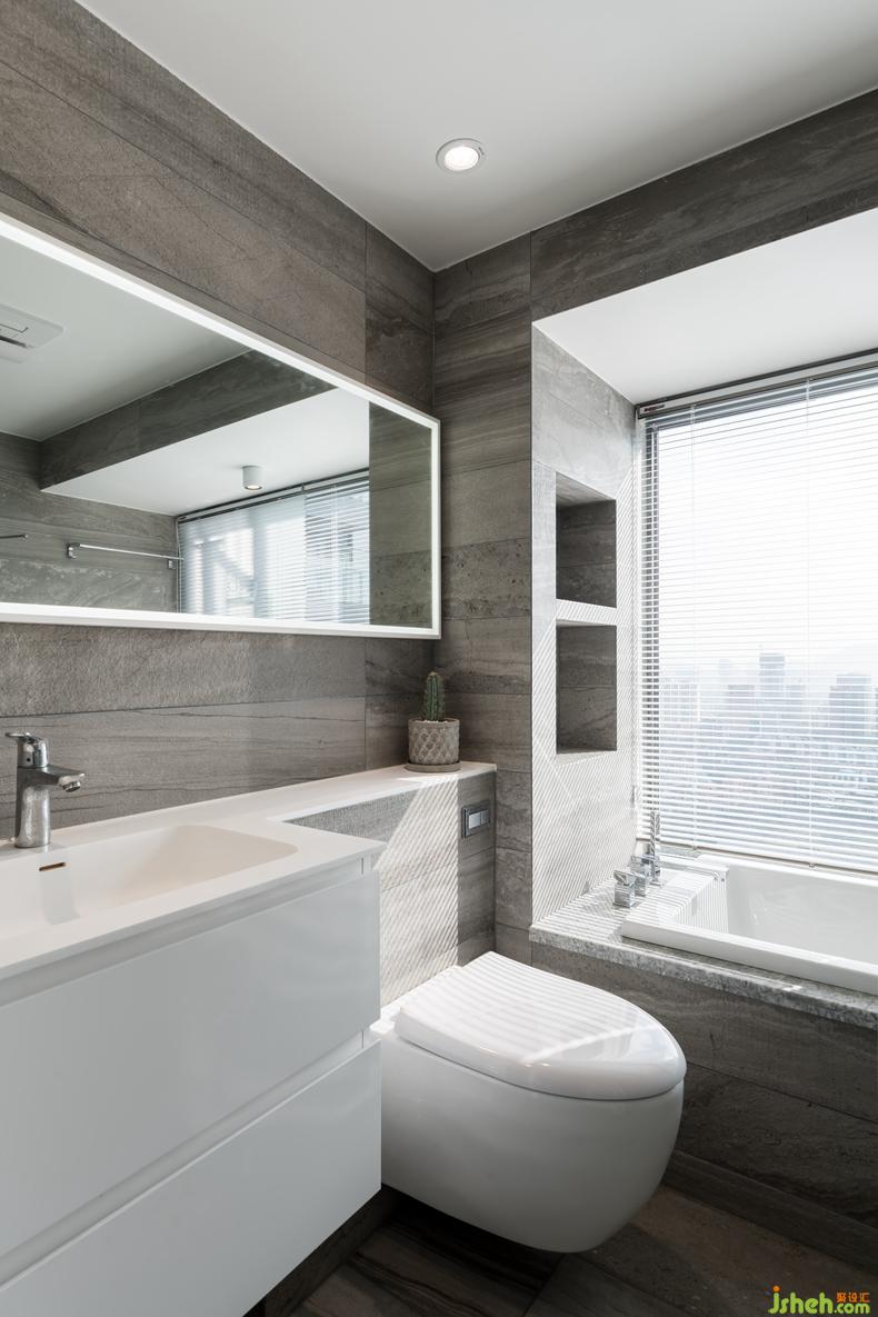 主卫:壁镜的白框设计突显出灰色壁砖的纹路及质地。白与灰的搭配给人一种简约中带着现代气息的高级感。