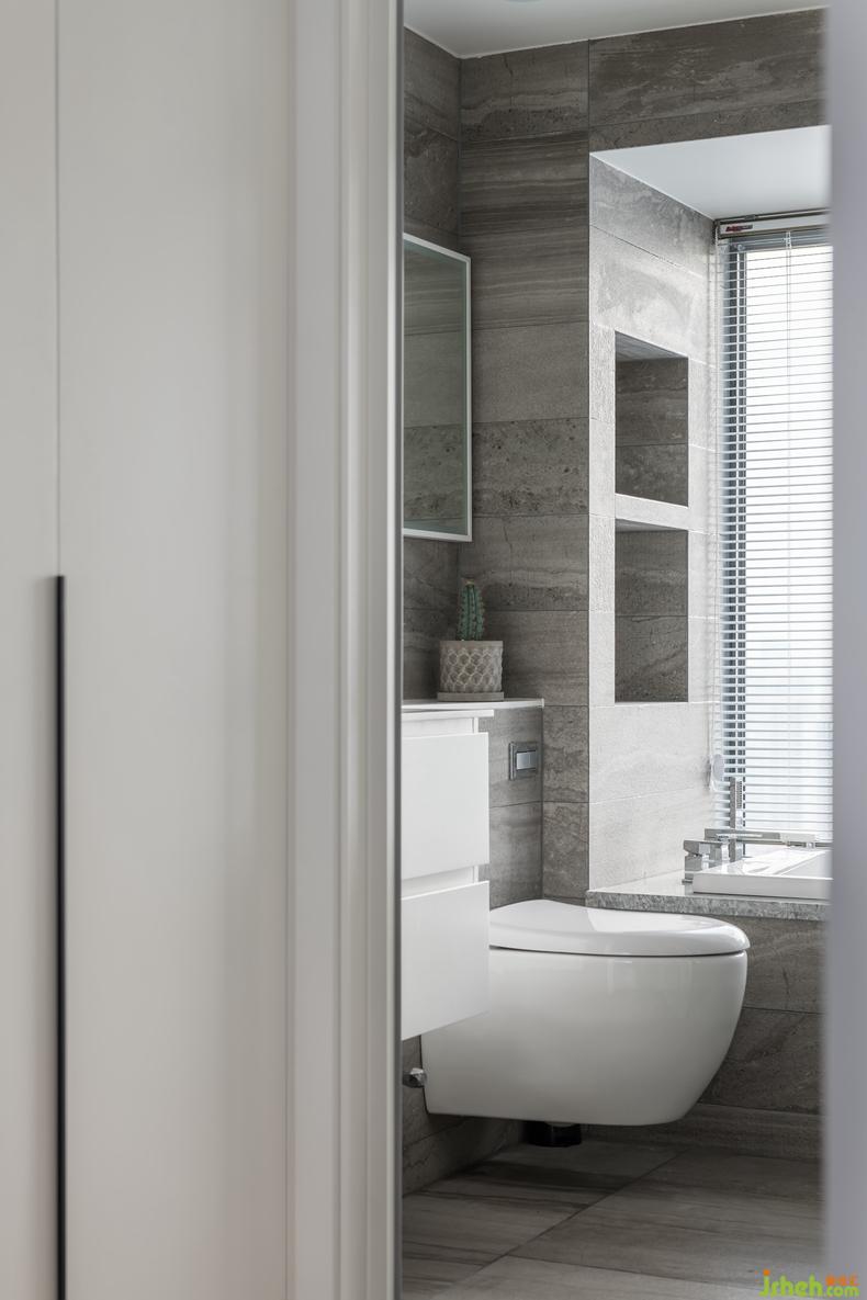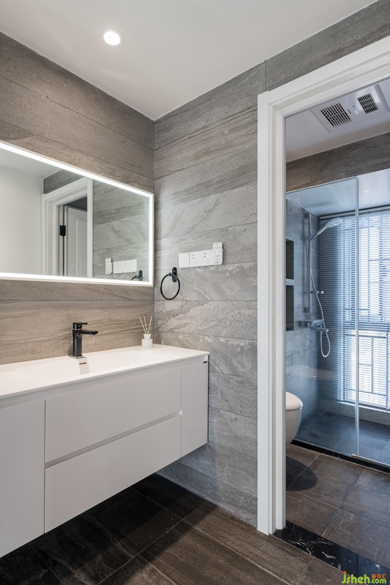 设计师开放公共卫生间的洗手台区域,与悬挂马桶和淋浴间区分开来是为了调整狭长的过道空间,与过道区域共享。室内设计师