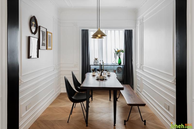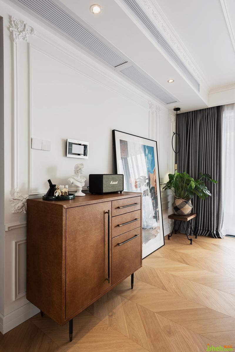 加入复古元素让整个家浑然一体。色彩灵感来源于斯洛伐克@Evelyn Bencicova的摄影作品,她的作品保持着一贯的成熟构图与饱满的叙事性相结合,运用冷淡的色调渗出浓厚的氛围,色调在某种程度上,令观看的人沉入其中无法自拔。 所以设计师将作品中冰冷的色调进行延伸,大面积的运用到空间设计中来。结合居住者的浓厚艺术气质在空间中大胆加入黑色,并且利用黑胡桃木进行调和,提高空间色彩饱和度。最后加入油画及金属配饰营造出赋予独特意义的复古气息。 深圳装修公司
