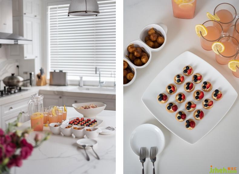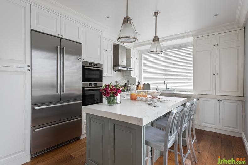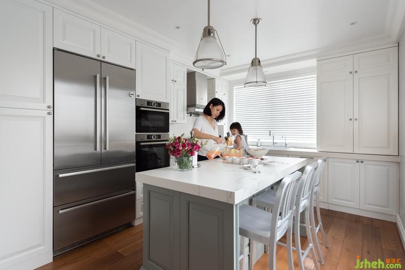 岛台大理石台面与白色橱柜交相呼应,这使厨房跟岛台不仅从视觉上是一个整体,也加强了二者的联系。厨房在国外经常是一家人交流最直接的地方,大人做饭,小孩写作业,岛台/餐桌对不同阶段的人有着不同的功能,但有一个共同点,便是拉近了一家人的交流。