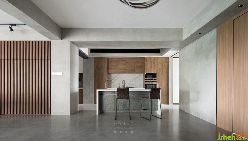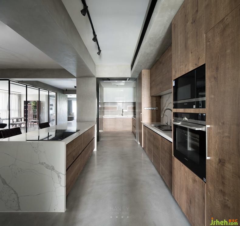 大片的木色与岛台的白色强烈对比,增强空间立体感。内敛附有层次的木纹和纯净明亮的白色大理石,分别作为灶台区/收纳区 还有岛台的主色调,泾渭分明的大块对比色,为厨房空间营造出生活的韵律感。