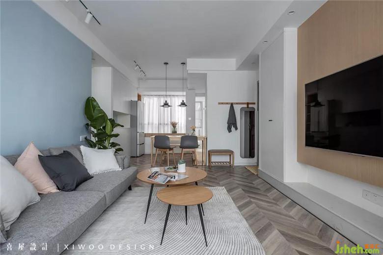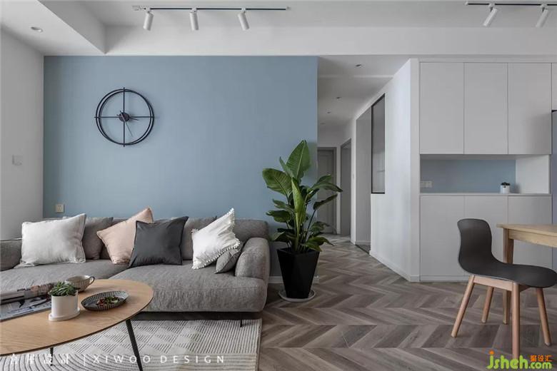 装修公司选用的墙面因海蓝色的魅力加持,延续至不起眼的餐边柜处也能使其c位“出道”。仿鱼骨拼的木地板带给我们的绝妙视感,优雅、舒柔、精致。