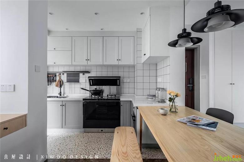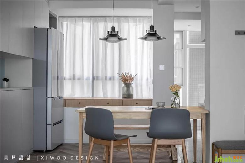 开放后的厨房与餐厅形成一条流畅的使用动线,利用飘窗增加的隔板柜和抽屉自然构成一处集储物和操作的实用面。