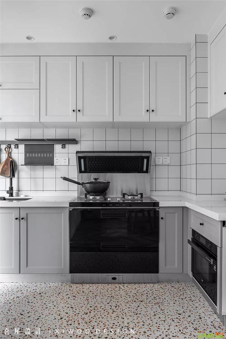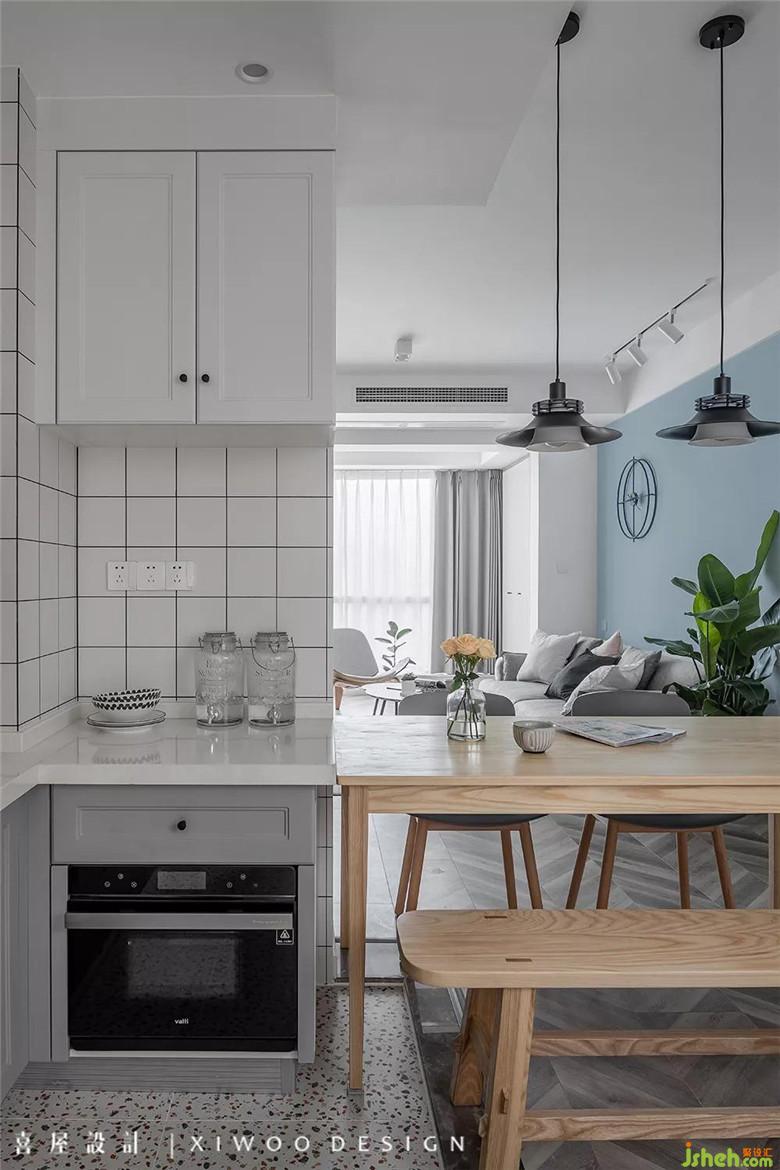 平静柔和的雾霾蓝橱柜、洁白的墙砖、碎色地砖,三餐四季就在这一片勃勃生机中流转,遗忘了时间。