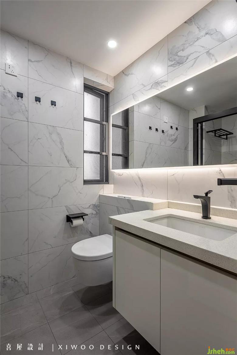 卫生间瓷砖的选择上主要以干净防滑入手,壁挂式马桶和浴室柜的排列无缝衔接组合,做到卫生无死角。