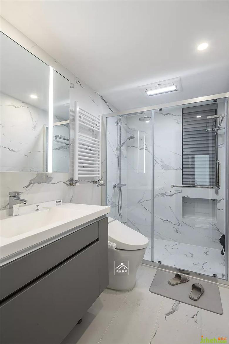 卫生间采用白色石材纹理的墙地砖一体。带灯光的镜柜方便使用。