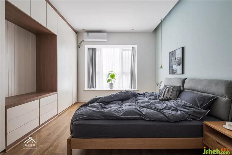 主卧室床对着做了一面墙的衣柜,中间可以放电视。