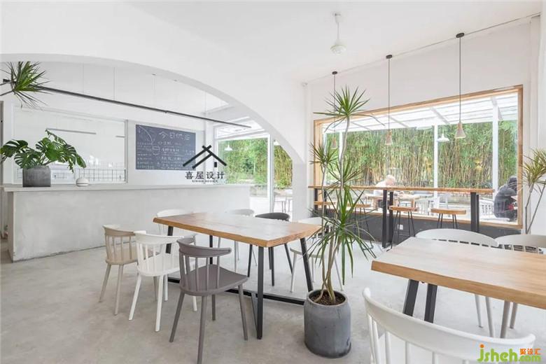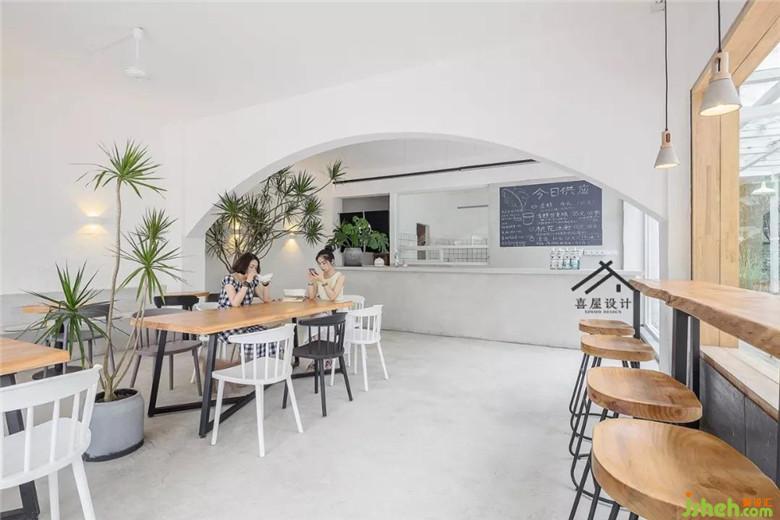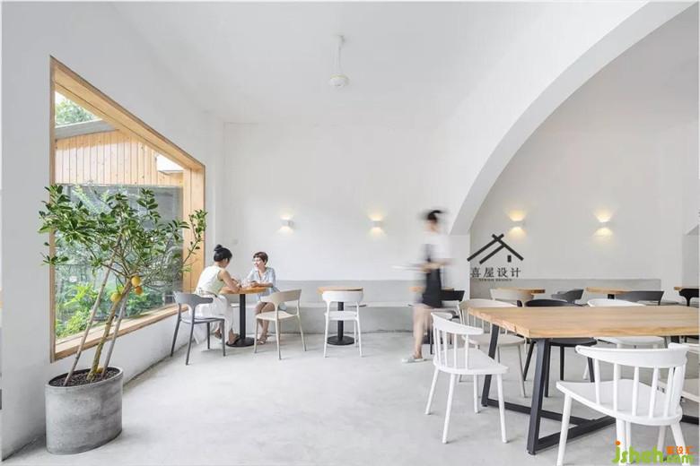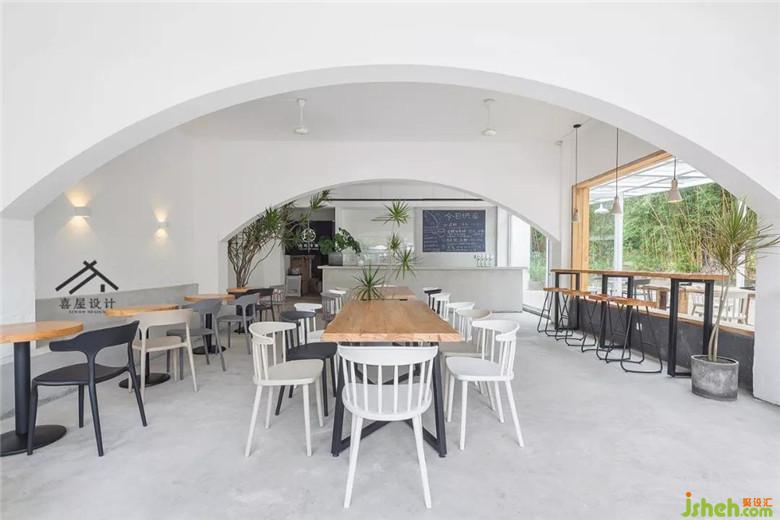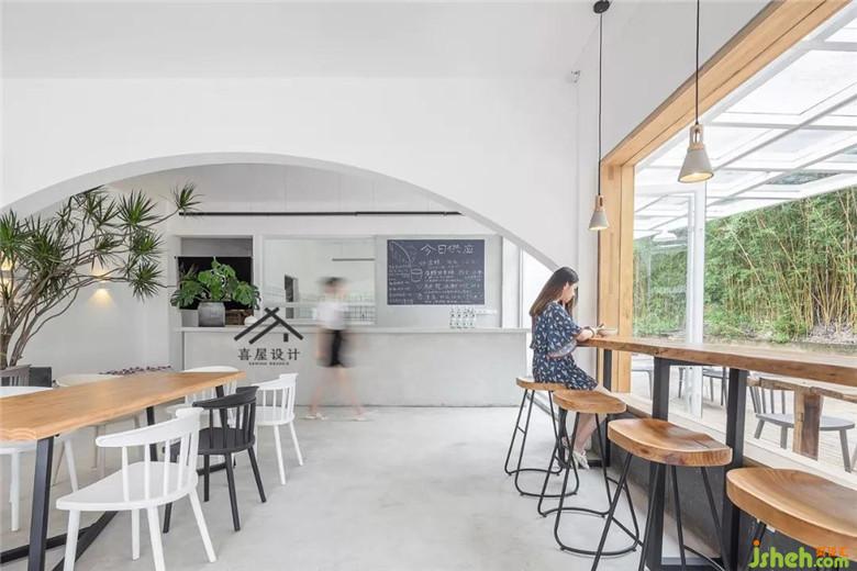 原店是一家荷塘月色临街的铺面,以前这里是卖鱼的,内部装修比较杂乱,于是我们把室内地面的砖敲掉,做了水泥地坪,节约开支也方便。原室内两个横梁自然的做了拱形门洞。