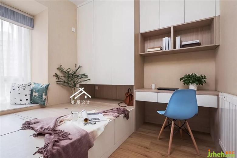室内设计师在次卧室做了榻榻米兼书房,榻榻米宽度1.5米,还剩下1.26米做了书桌,榻榻米侧面做了抽屉,方便抽出来就可以储物,榻榻米里面做了可以上掀门的储物空间。