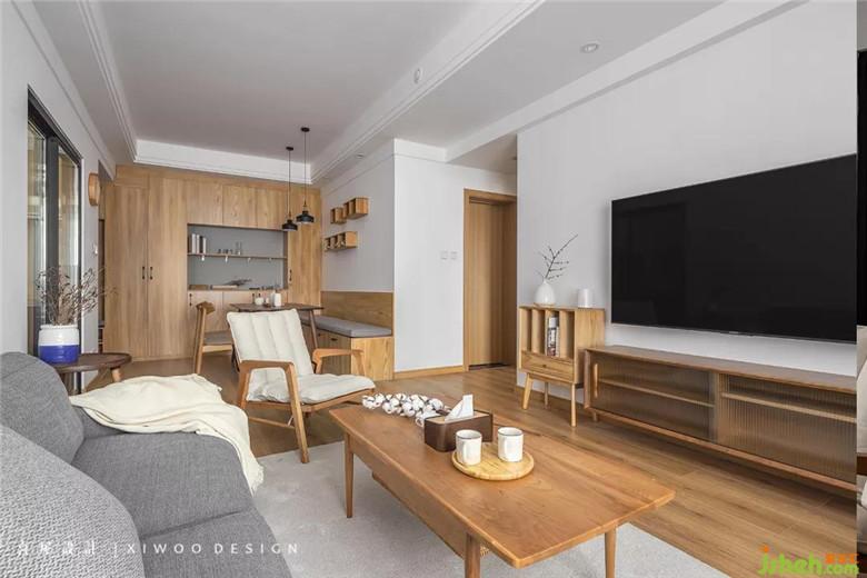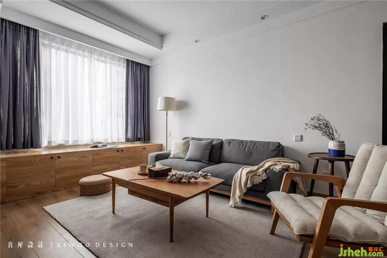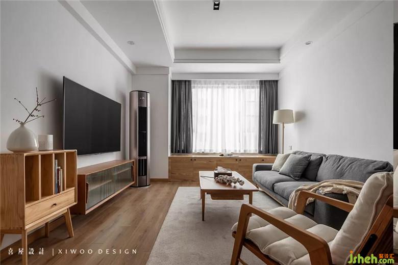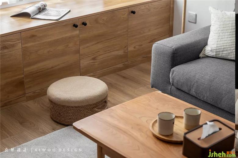 客厅换掉开发商提供的地板,选择更为适意的原木色。并利用窗户下方墙体的位置,以整排高度450mm飘窗柜打造立体空间上的附加面积,储物与坐卧均可。