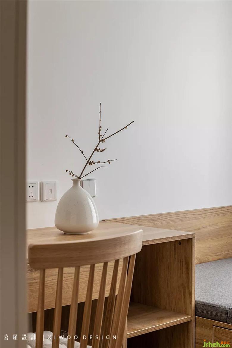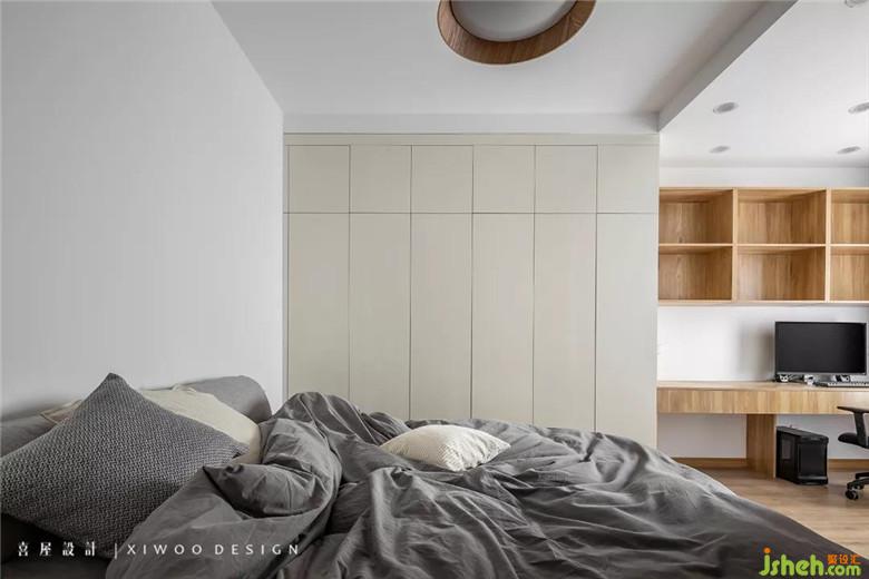 主卧以清浅的白色、静谧的灰色和沉稳的原木为主基调,不做过多装饰。室内所有物件,或袒露材质上的肌理与质感,强调睡眠空间所需的舒适感;或融入整体感的衣柜和书桌,达到空间功能与比例上的均衡。