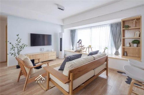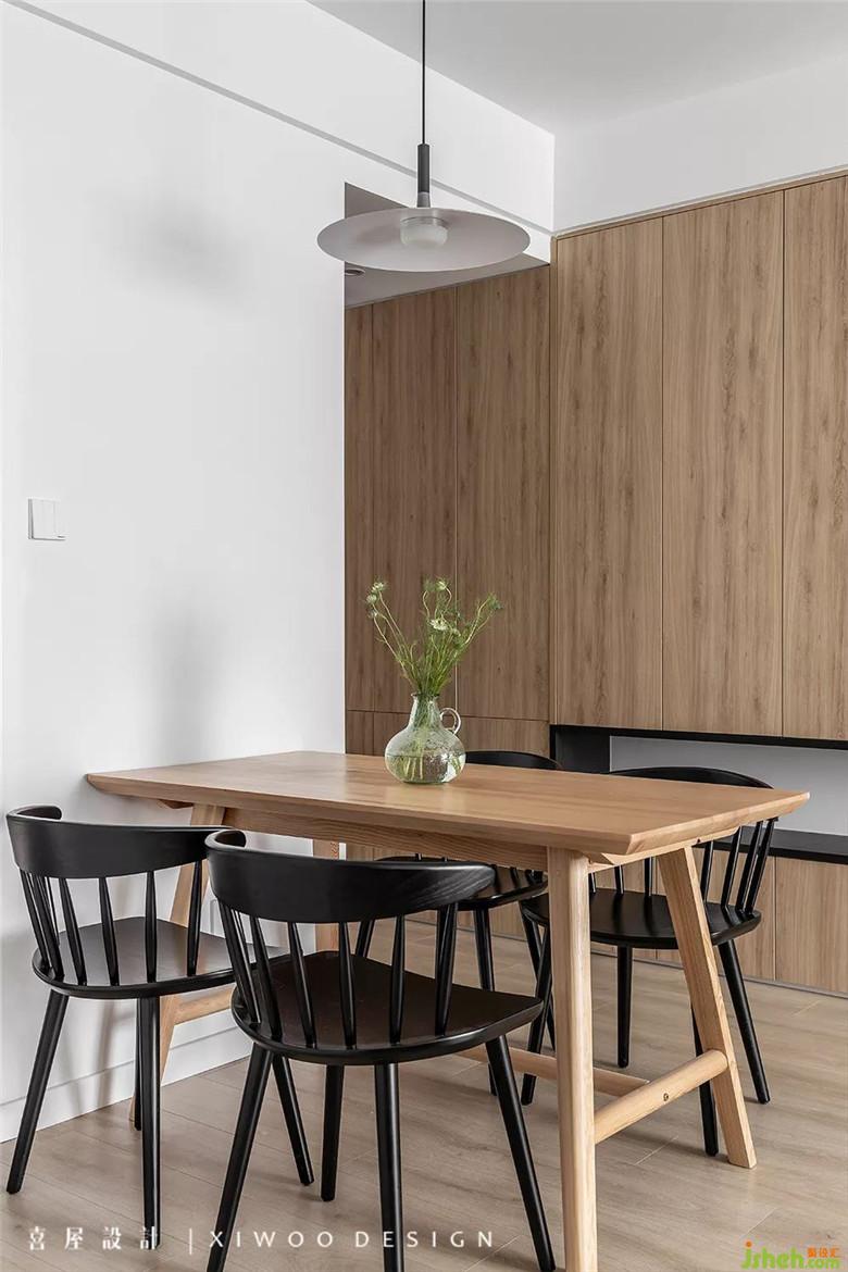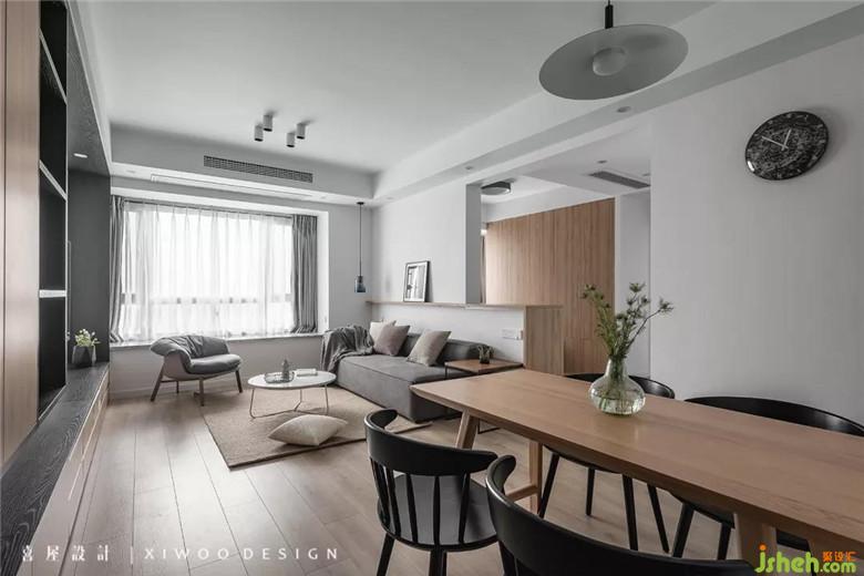 在局限和无限之间懂得取舍:从门厅延伸到飘窗的储物柜,囊括了鞋柜、餐边柜、书柜、电视柜,希望储物空间无限扩大,日杂用品都能得到很好的收纳和隐藏。