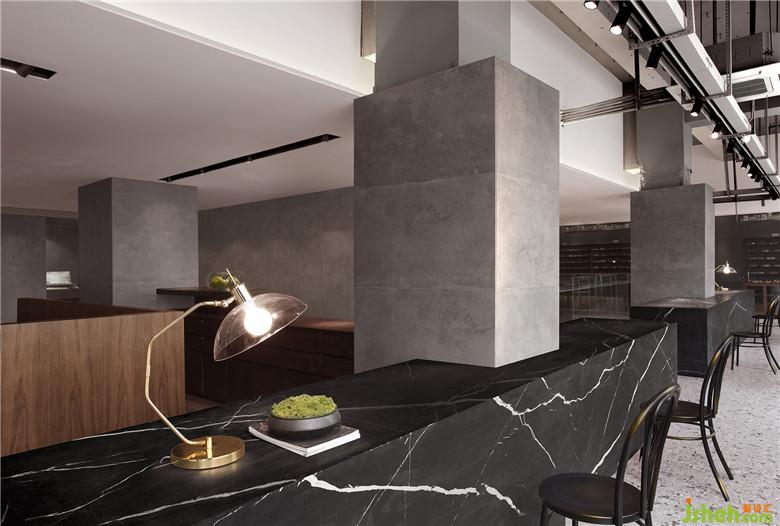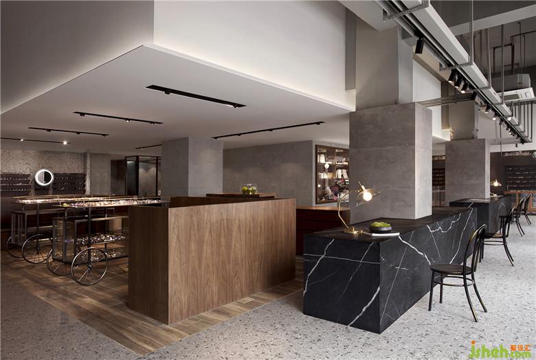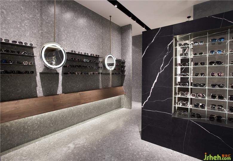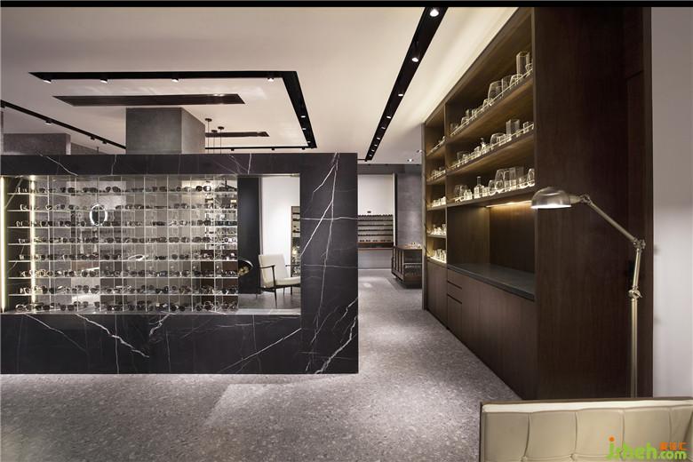 室内设计师结合眼镜的功能属性抽离出几种展示手法,固定墙面的黑铁展架更好的衬托出眼镜的主体地位,传递出阵列的美感。深色天然大理石和玻璃得组合更是晕染出一种精致优雅的调性,金属小车的造型不仅是对体块的呼应,更给人带来一种街头售卖的感觉。