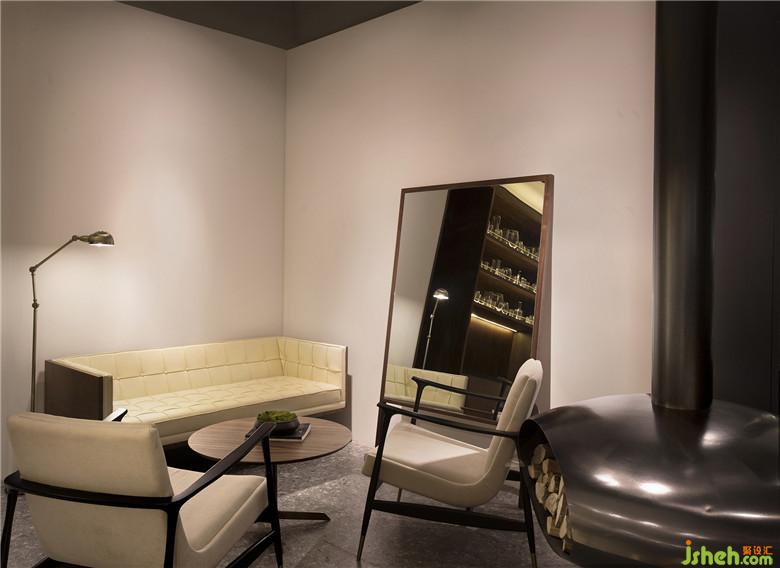 在休息区特意营造了一种会客厅的氛围,在质地柔软的沙发旁搭配精致优雅的壁炉,让客户能在选眼镜之余放松一下。