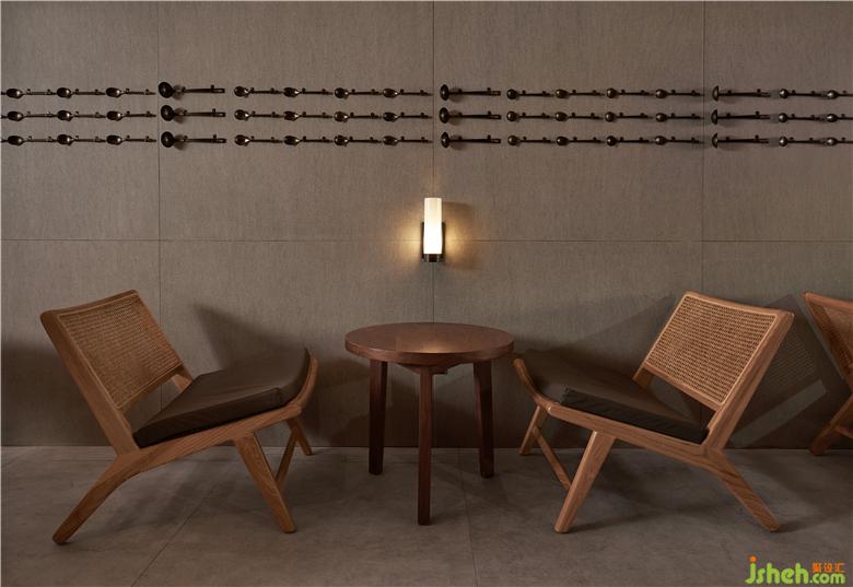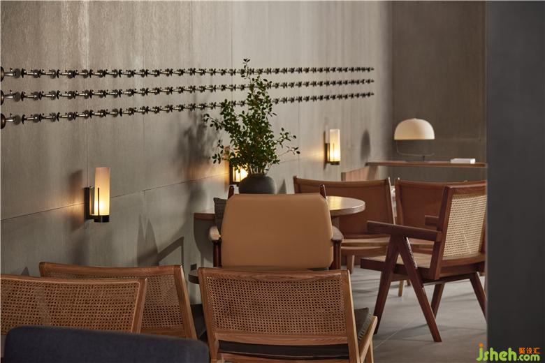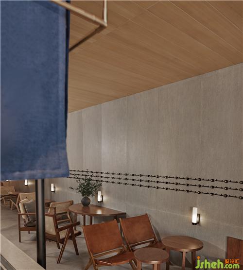 在设计上,设计师在墙面用干净的灰色与顶面温润的木饰面作为基调,让空间附有美感的同时又具有丰厚的生活气息,精致金属管的搭接结构,及其点缀的蓝色麻布帘子更是让整个空间更具丰富的想象力。餐厅装修演绎成了现代视觉语言,重塑了回忆的空间……