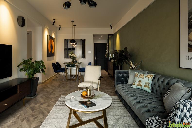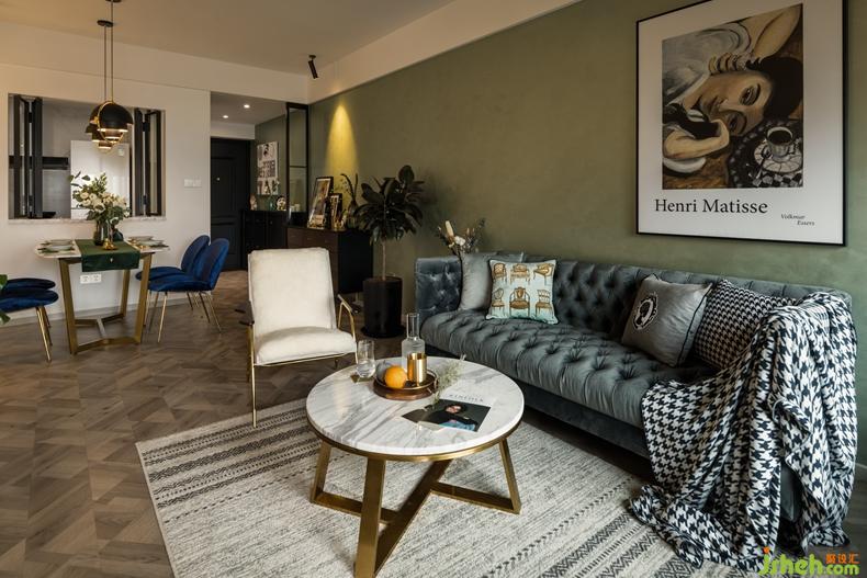 一面墙的尼丝绒绿搭配灰调的菱形复合地板提升了整个空间的复古感。