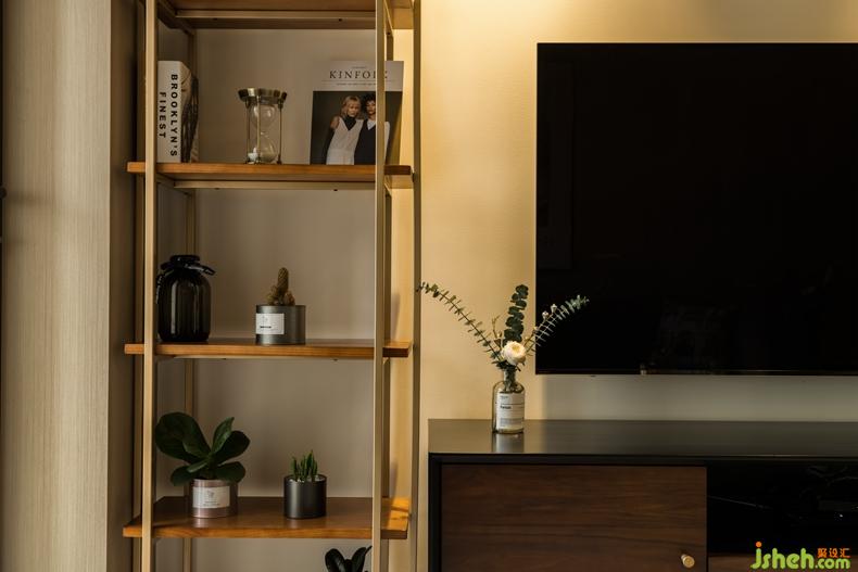 电视角落的置物架上放几盆绿植,木调与简约又不失贵气金属线条相互连结,将整个空间的精致和现代感完美的诠释。