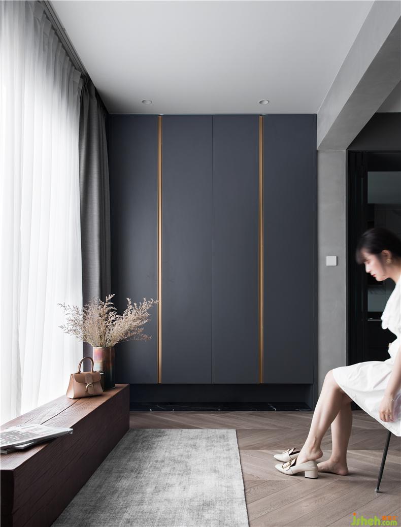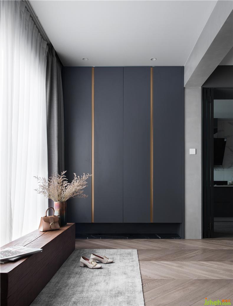 延伸性设计一门到顶的鞋柜,以同样的长度融入在柜门中的金属把手,视觉上的美感,室内设计师空间中的高级感。实木的长条木桩,它中和了冷冷的灰调,微微暖化了空间的色彩,达到了一种平衡