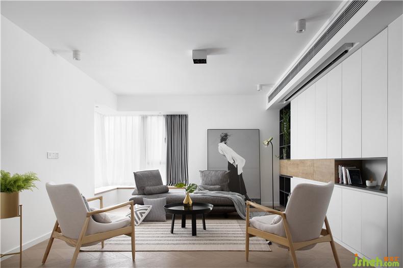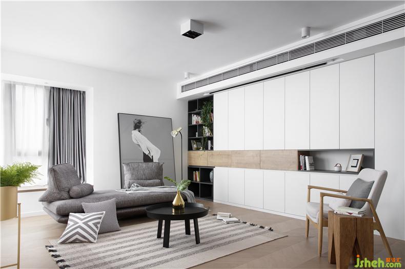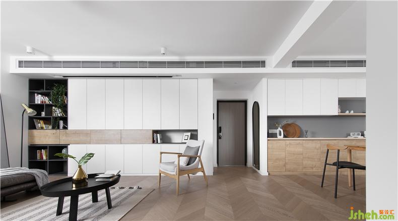 舍弃了电视墙,以投影幕布代替。一整面的无把手柜门,室内设计师线条明了的一门到顶储物柜,增加很多的储物功能,视觉又简洁干净且提升家的高级感
