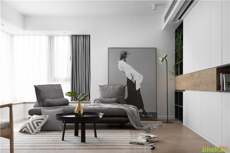 由于不想阻碍视线从沙发看过去的飘窗,不能选择有背靠沙发让空间显得拥挤,室内设计师所以选择这款写意空间可随意移动背靠的沙发,从视觉上来说会变得有空间感。如果将沙发上的移动靠背拿下来,它还是一个沙发床。在这个空间,实用与美观也是完美融合啦