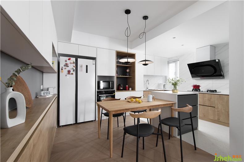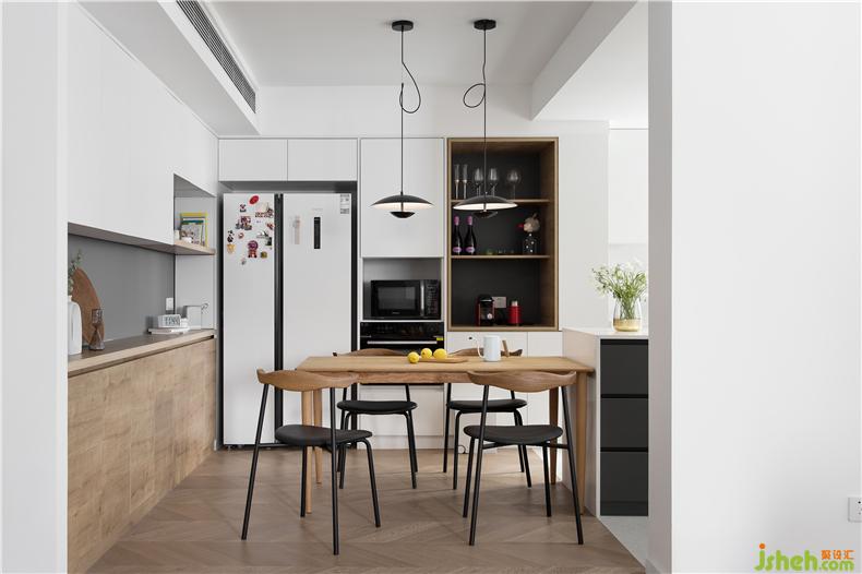 将餐厅与厨房的墙面打通,并将生活阳台进行了封窗,巧妙的将开放式厨房与西厨与餐厅融合在一起,还是那么舒适。悄悄的从屋主本人了解到除了客厅,餐厅也是最喜欢待的一块角落,经常给自己泡个茶静静的待着,或者放台笔记本,伴着键盘声、鼠标声认真的办公室内设计师