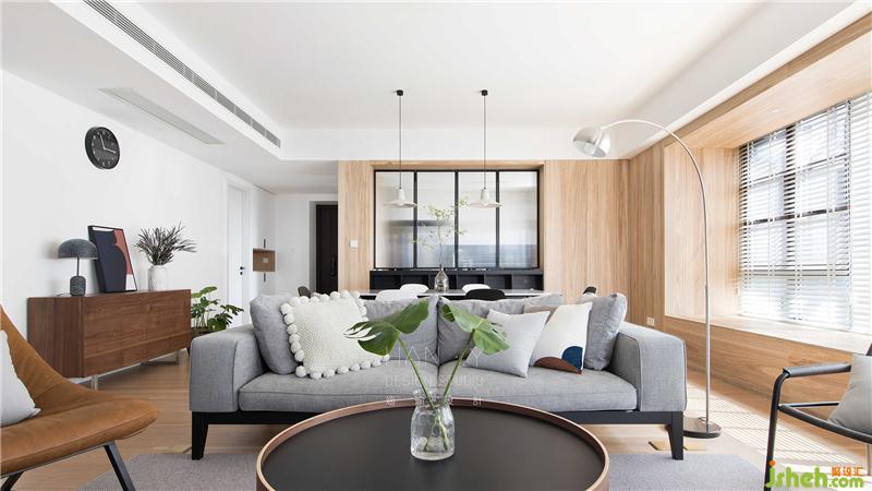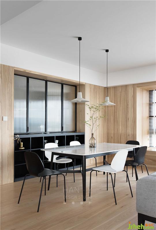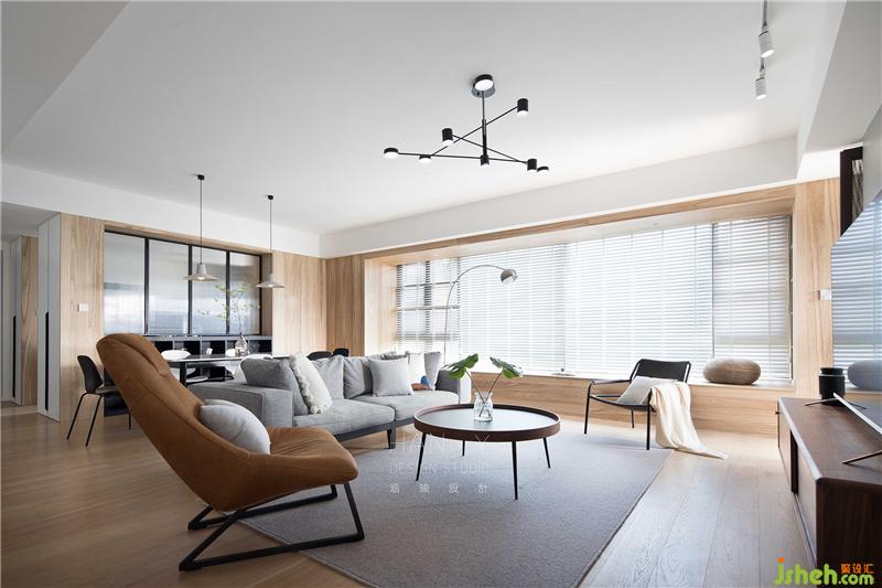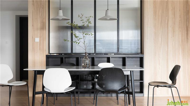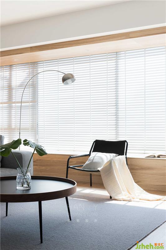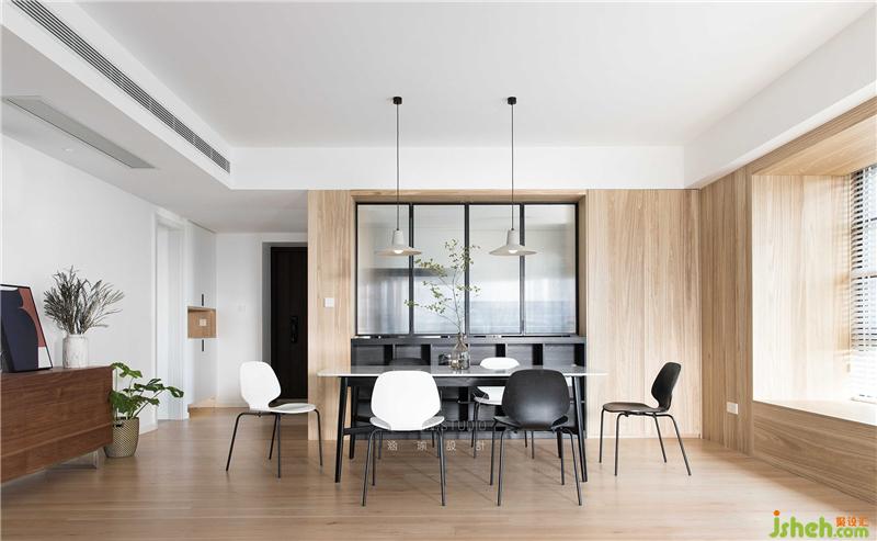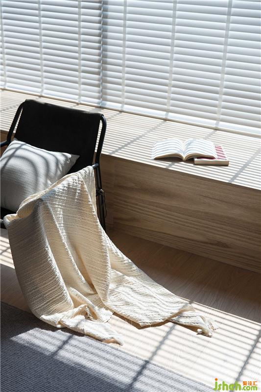 开放式一体化设计的客餐厅,有意无意的划分着区域,将天然材料融入家中,感受温和柔软的居家氛围。诺大的飘窗与百叶随时恭候着阳光的到来,去演绎不同的艺术光影。