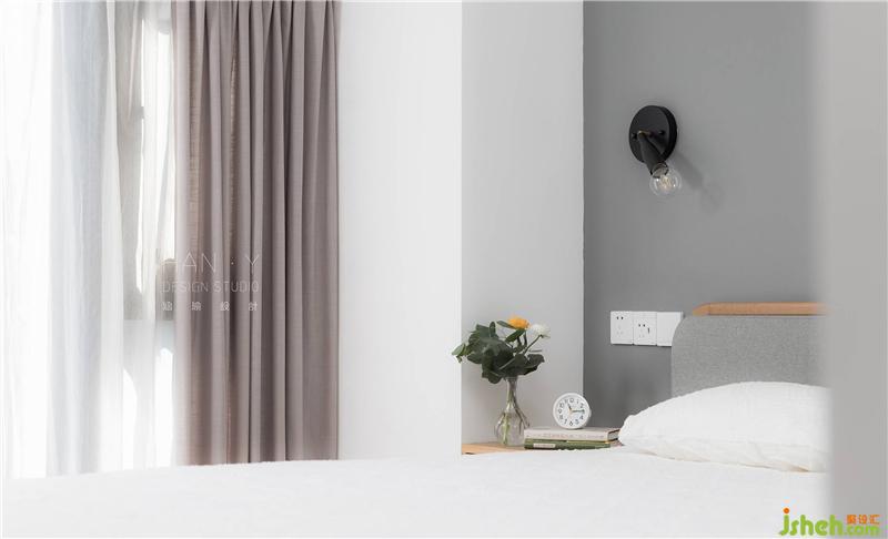 主卧空间整体以干净温馨的设计为主,床头墙面采用高级灰色的格调,搭配自然的木色,结合大面积的白色营造一份简单,明亮的空间。加上这个空间采光特别充足,视觉空间上也宽阔了很多。