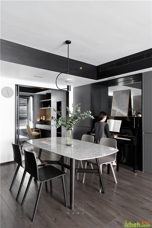 为了避免黑白空间的单调性,加入了透亮的白色大理石纹理,在无形间给厨房获得了扩容,缩小地柜的深度增加台面的空间,布局“二字型”的动线舒适操作,特意设计通透感很强的玻璃推拉门,让女主人可以尽情享受欢愉的私厨时光。