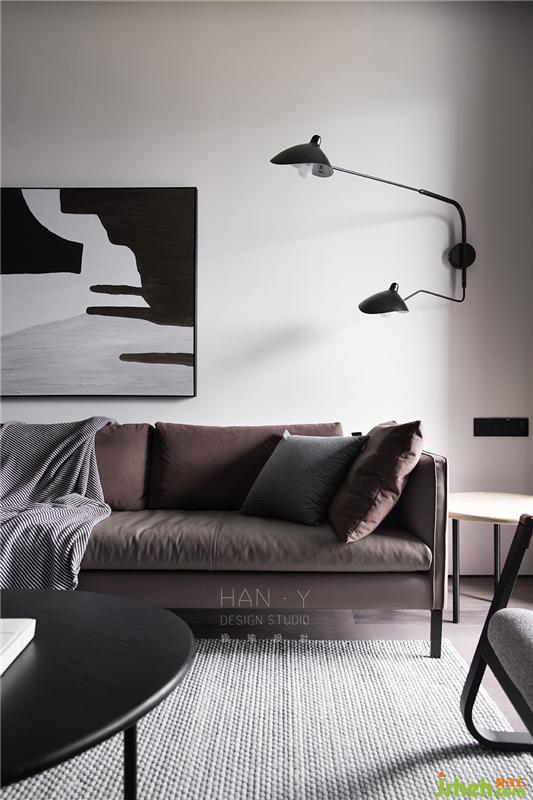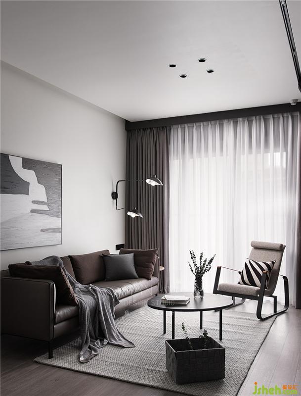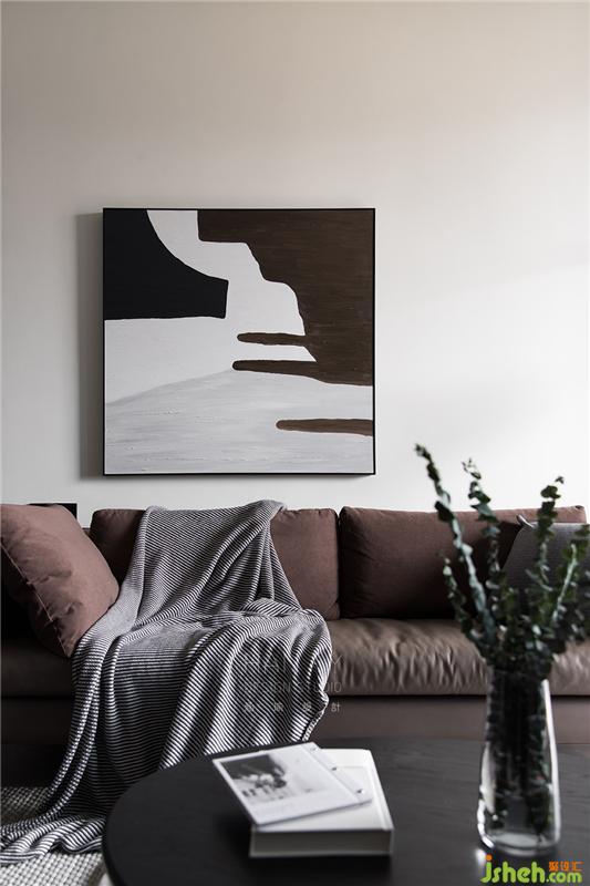 清水泥质感的运用,与深棕木色的冷暖对比,让这个简洁的空间,保持色调的纯粹,两者相得益彰。主沙发选用皮布结合的材质,用色上与之呼应的深棕色,增添空间温度。