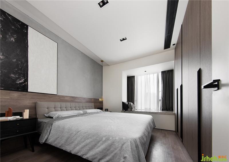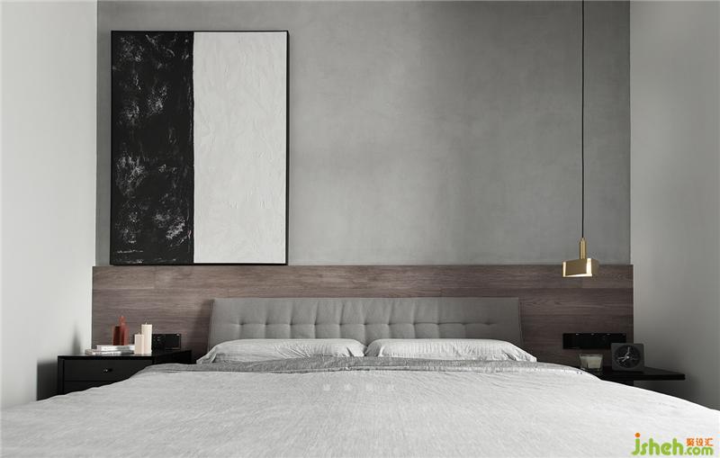 主卧延续了公共空间的色调,整体设计保持干净纯粹,不做过多装饰,而是点到为止。深圳装修设计床头背景墙采用木地板上墙的形式,视觉空间的扩大,天花吊平顶的形式,不过多分割空间。衣柜面积适当的增加,也让过季衣物得到合理的收纳。