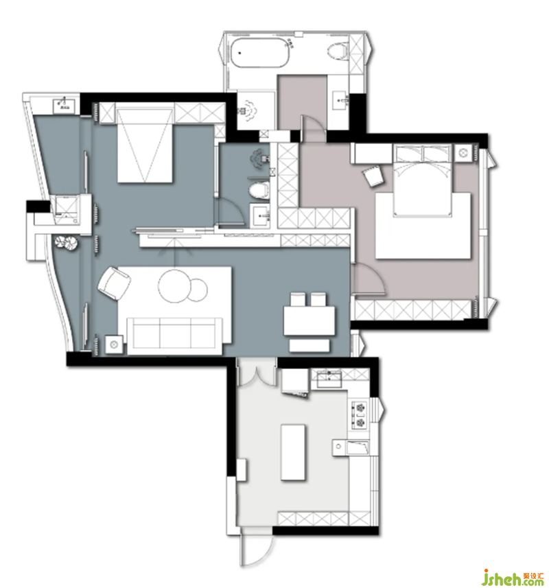 ① 由于原户型厨房区域狭小,利用率不高,因此将入户区纳入合并为中西厨,设置岛台,增加了早餐及简餐的用餐区域。