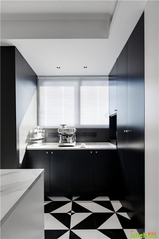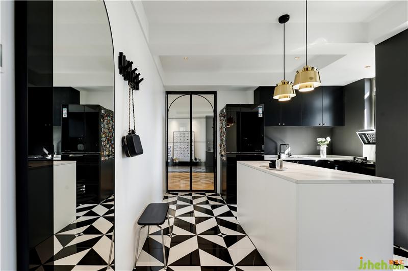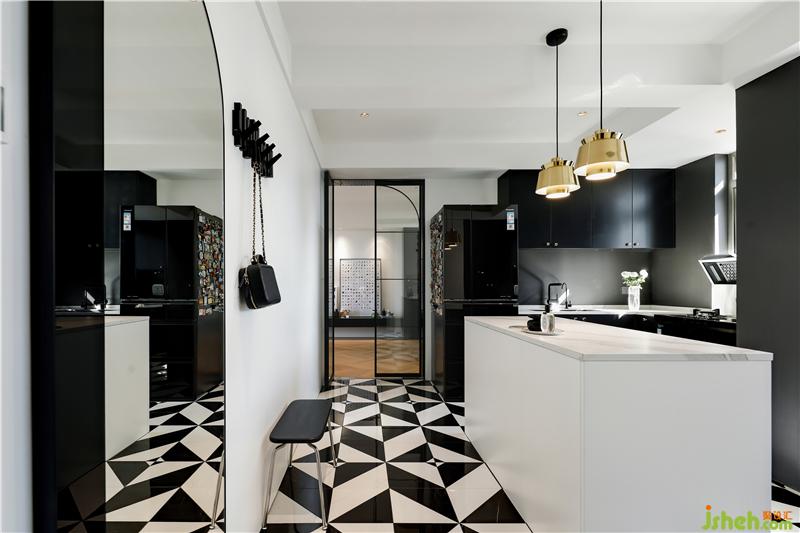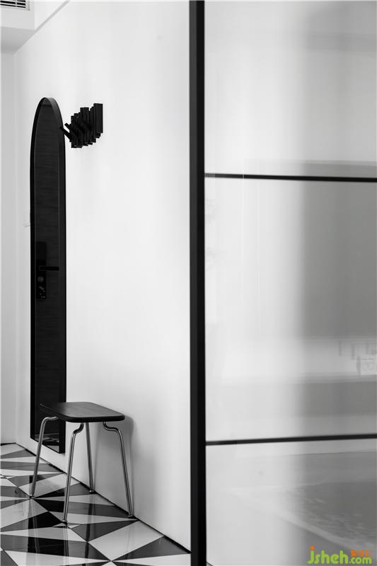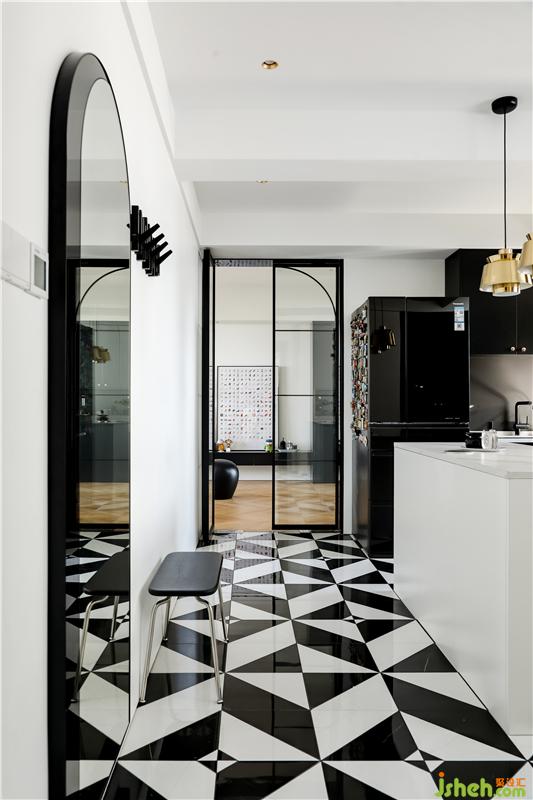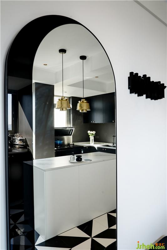 两个原本独立封闭的狭小空间,如今成为了明亮贯通的开放式厨房区。充满趣味的拱形穿衣镜,与黑框玻璃门的独特造型,让进门视线得到缓冲与延伸,保持各自独立性的同时又维持空间的通透性。
