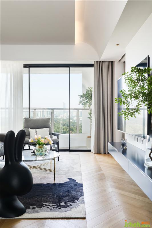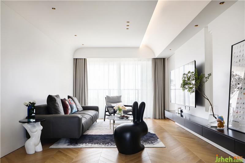 弧形天花内藏灯带,无主灯照明更显空间层次,搭配上浅灰色窗帘让空间多了一份宁静。
