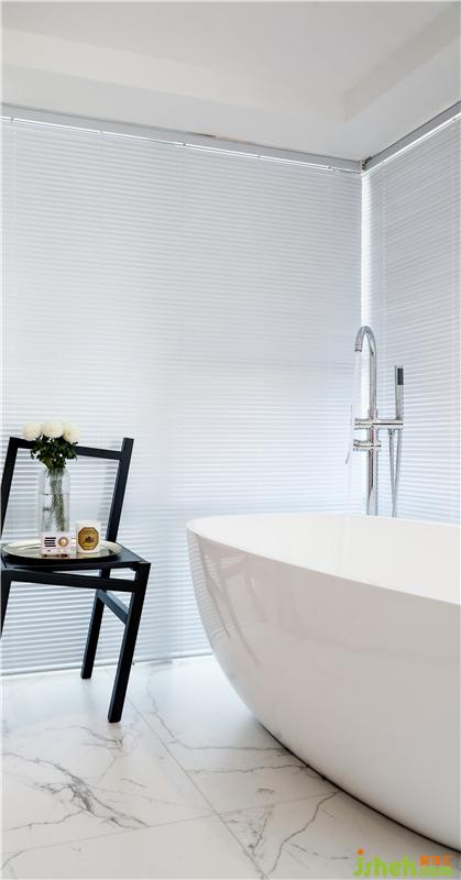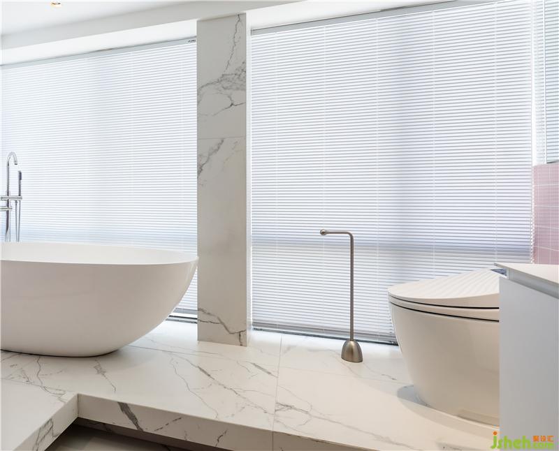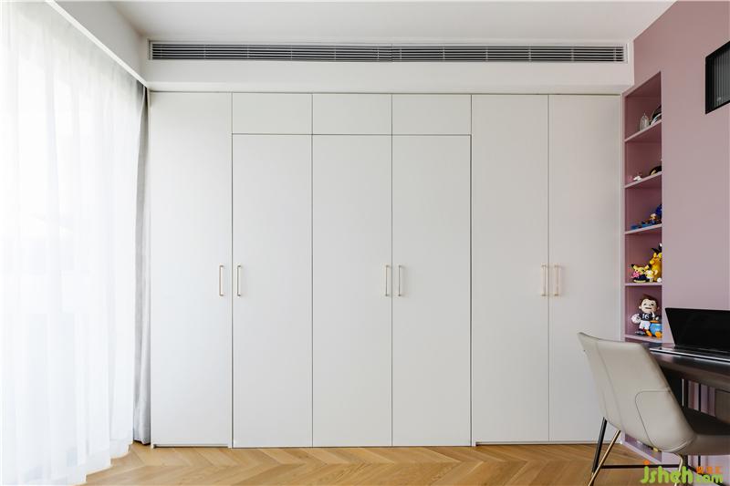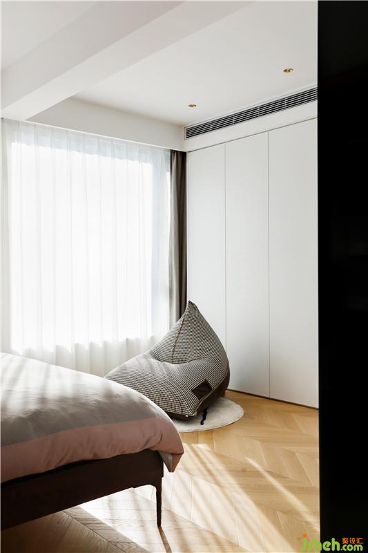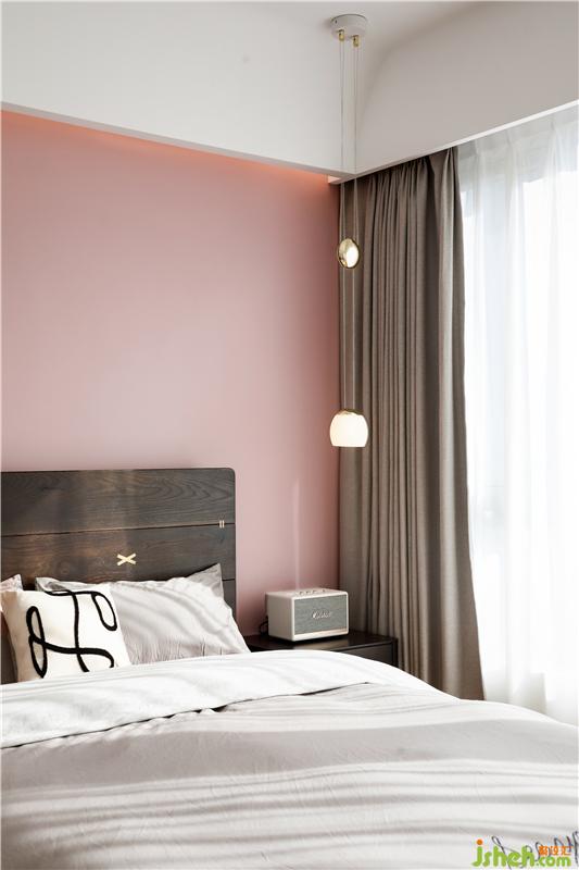 主卧粉色与白色的搭配使视觉上轻快自然。木质床头与金色灯具在这种隽永的质感中注入复古情调。