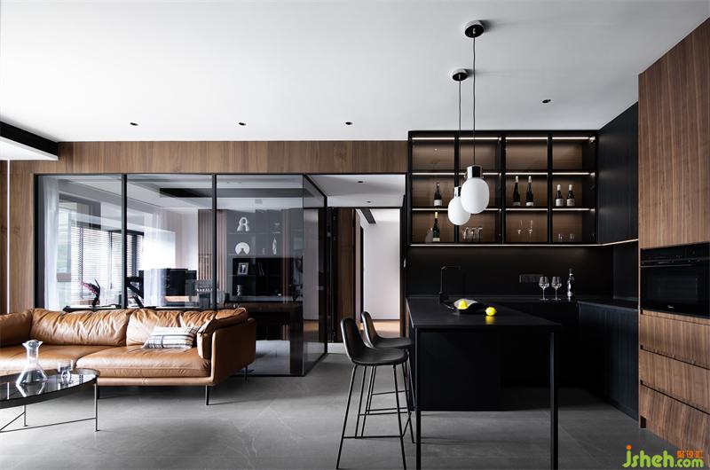 暗色系主题的家居设计语言搭配胡桃木色将空间兼蓄并收,营造出睿智而低调的独居氛围感,一面酒柜、一方吧台,隐匿在黑白二元对立的酷感中,这是明亮空间里无法带来的优奢与神秘感……