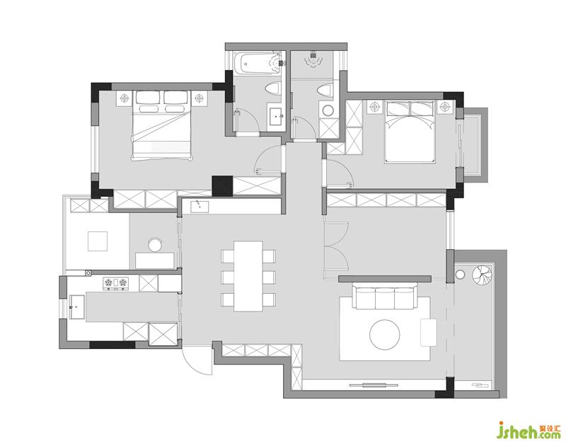 在空间布局上保留原来的四个房间,将厨房一侧的卧室墙体拆除内移形成独立书房,拓宽了入户及餐厅的面积,使中西双厨成为可能;客厅一侧的小次卧通过墙体改造,空间扩大并兼顾储物,同时用玻璃材质隔断在视觉上形成统一贯通的自由格局;