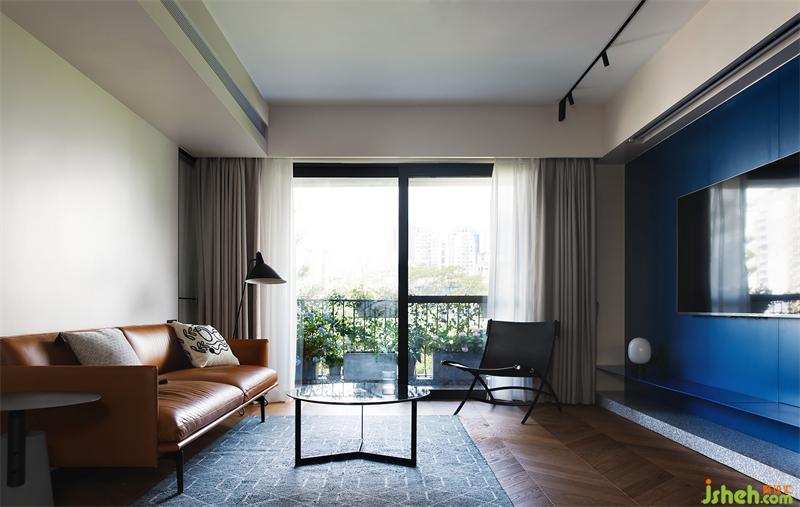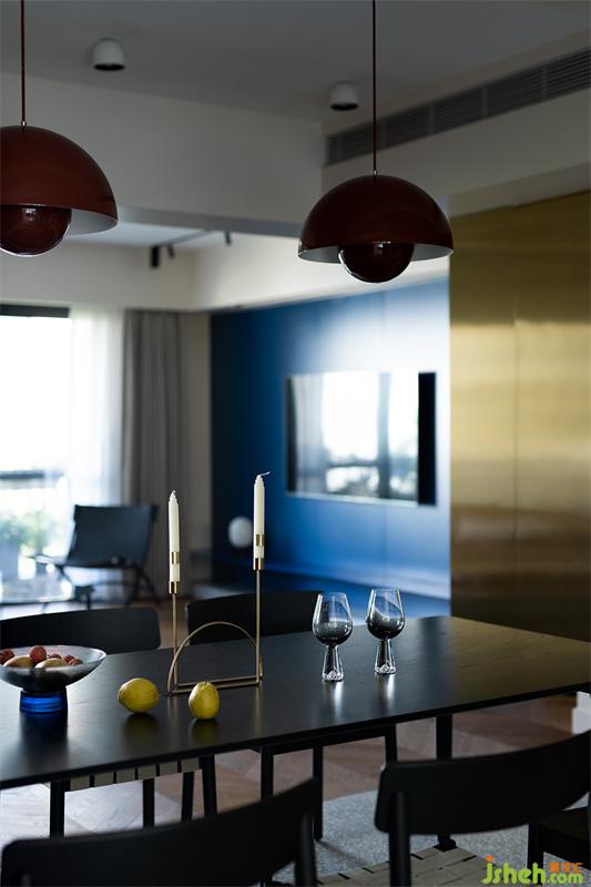 客厅通铺人字纹木地板,温润的质感与餐厅形成材质上的空间划分,克莱因蓝与爱马仕橙的张扬对比,一面沉静温婉如女主,一面热情健谈如男主。