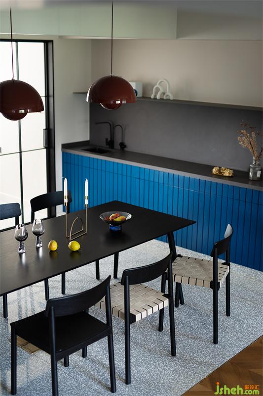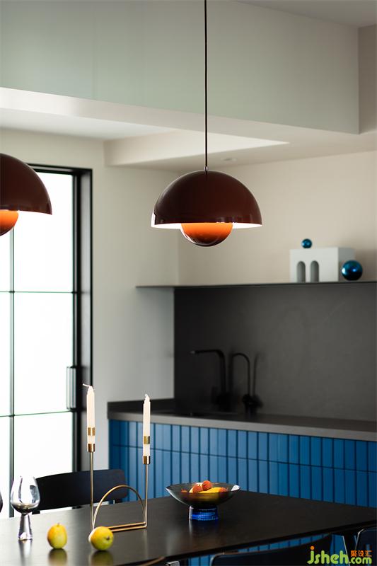 拓宽后的餐厅区,处于开门即见的C位,水磨石地面与餐边操作台形成强烈的视觉冲击感,酒红色丹麦cabana的吊灯更是对整个空间点缀了一丝复古风情。