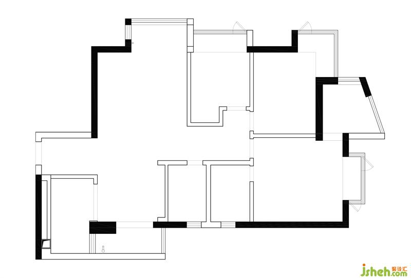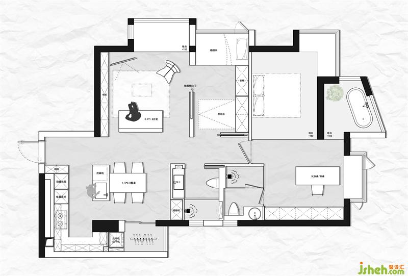 ③ 原本三房的格局改为两房,次卧利用两道暗藏移门优化了并增大了空间区域,与公共区域形成灵活的动线结构。主卧套间与另一间次卧打通,设置了独立的阅读办公与化妆区,并用地台划分区域。