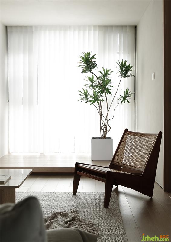 客厅与阳台之间没有做隔断,而是通过调整地面高低,做了邻窗地台,空间界限的模糊也让家有了更多场景可能性,赋予舒适且美好的生活状态。
