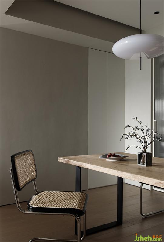 相邻空间的转换松弛而有节奏。客餐厅一体化设计,让公共区域成为“社交型”空间,色彩上秉承着统一的温柔素雅,平衡出微妙的和谐感。