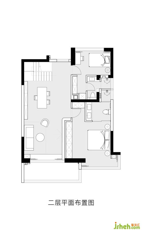 ③ 二楼改变了主卧门的位置,避免空间浪费,使公共区域更加方正。主卫一侧墙体做了内移,设置双洗手台,淋浴区借用儿童房卫生间区域,利用窗户达到很好的通风效果。