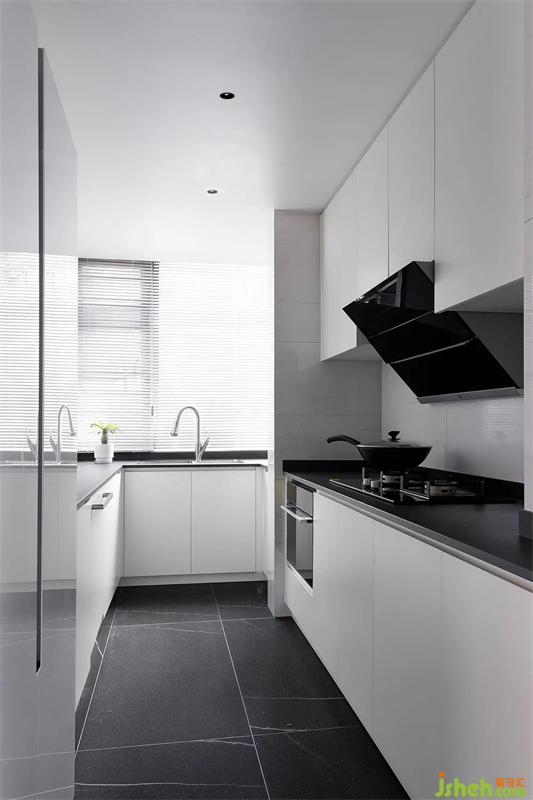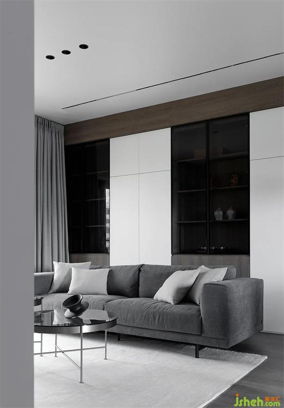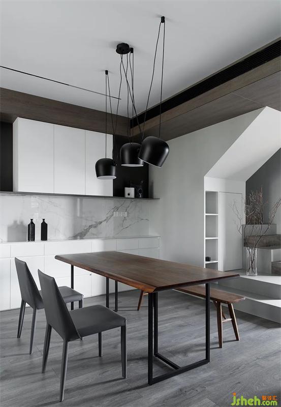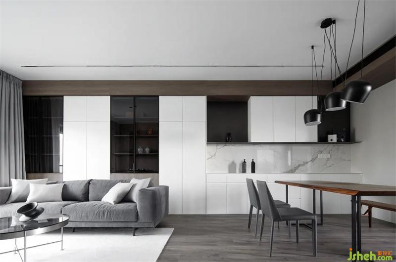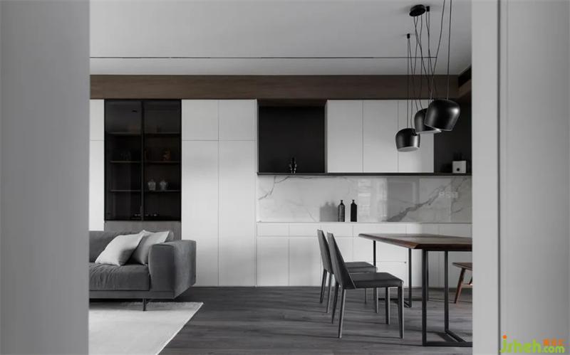 白色与木色的定制家具、大理石墙砖、黑色的钢板、玻璃,以及素雅的胡桃木色,呈现出大气脱俗的质感。表面上看不到多余的物品,实则巧妙的藏在设计当中。
