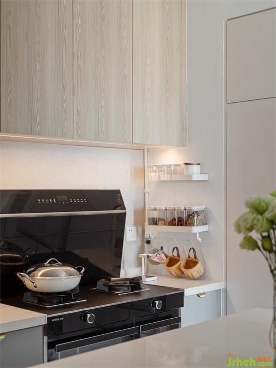二字型的功能布局,一边是中厨,另一边是西厨吧台与餐桌,方便爱下厨的女主,一个转身就可以轻松切换不同的烹饪方式,周末也可以和孩子一起做西点料理,培养动手能力,家装设计搭配上绿植和窗外的阳光,给每一次的动手制作带来更美好的心情。