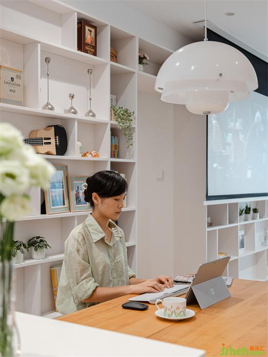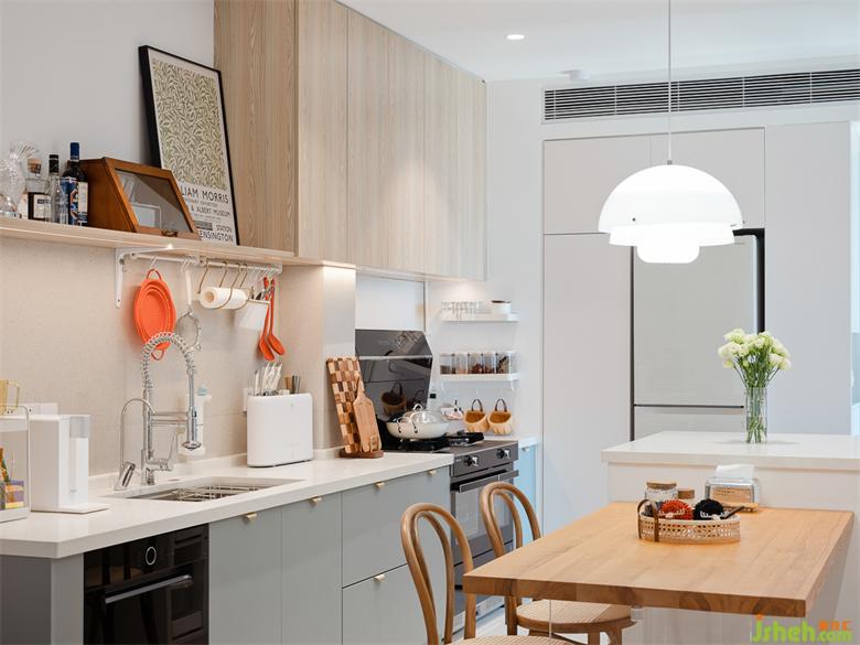 开放式的厨房好处是解放了原本局促的小空间,没有了隔墙,动线也流畅起来。家装设计一张定制大餐桌满足了男女主日常的轻办公,“悬空”的桌面,在视觉上变得轻量化,后方是客厅延伸过来的开放书墙,让物品的拿取更加方便。