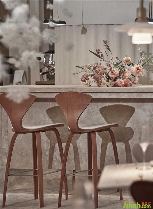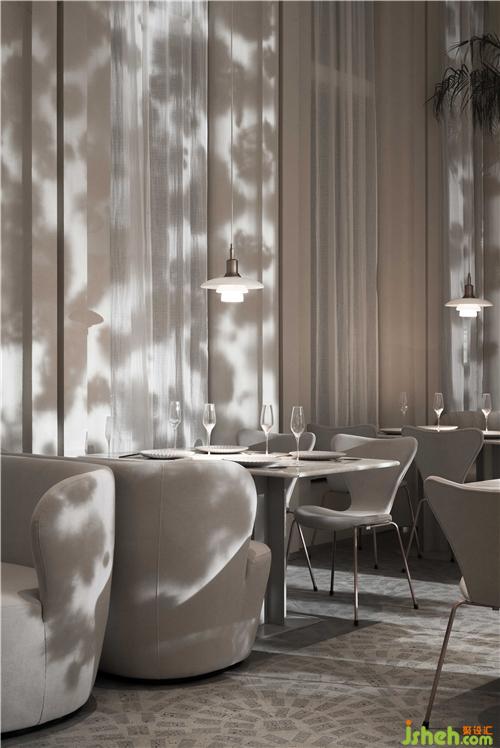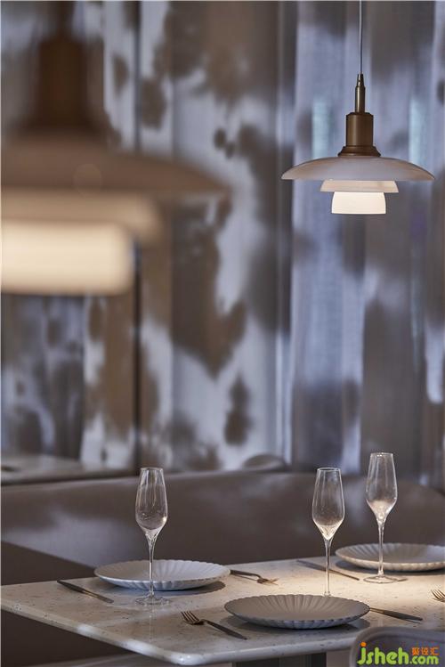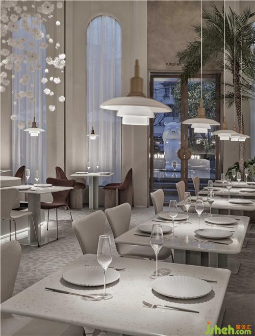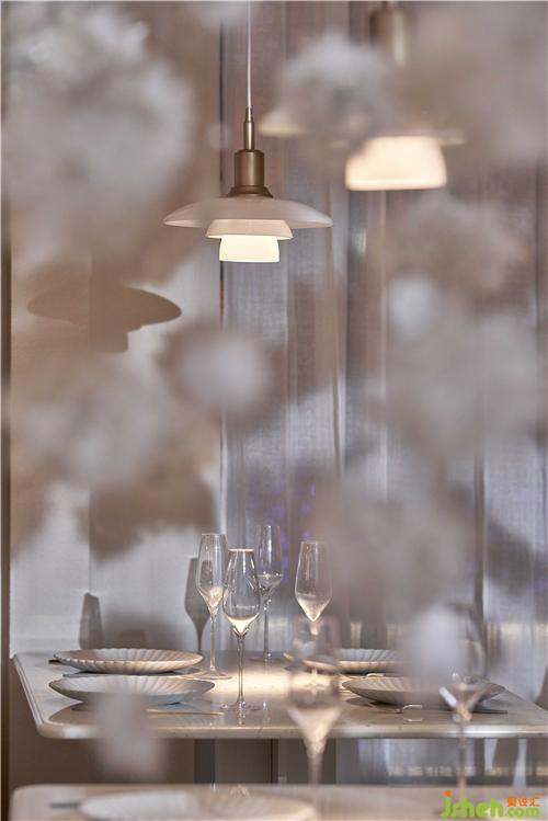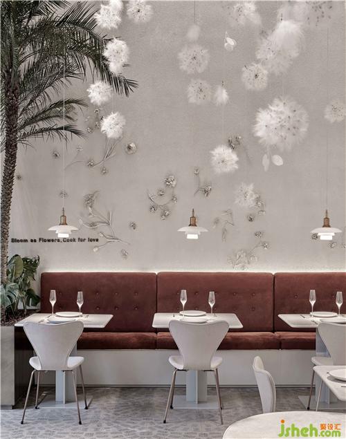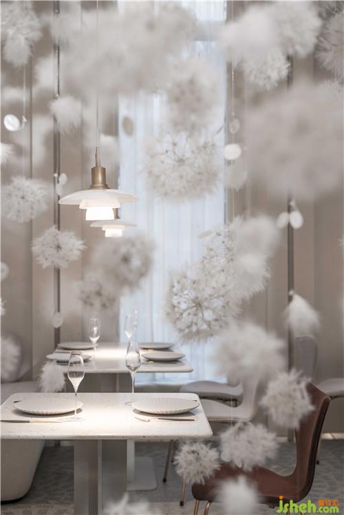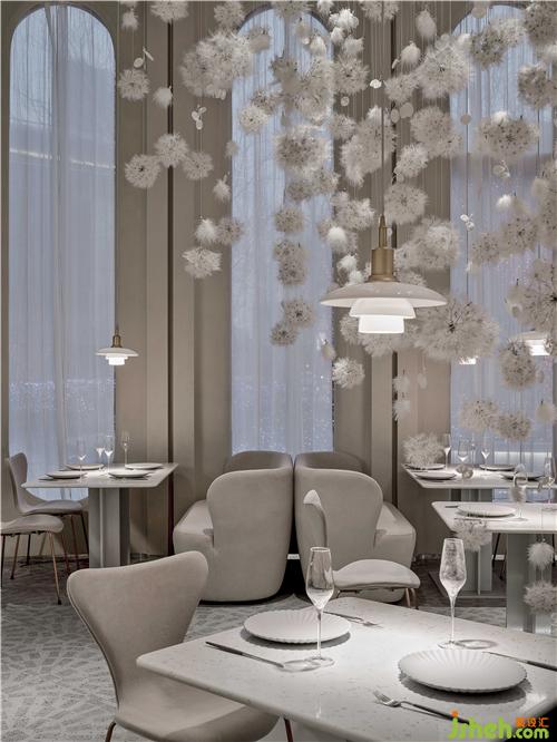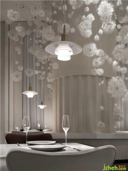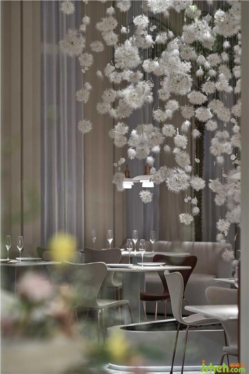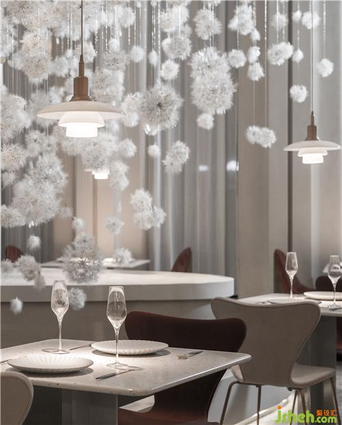 空间的物体线索来自蒲公英,我们设想蒲公英随风飘向大自然的和谐性,来自于生物和环境的有机互动,种子从母体脱离,散开飘动时产生的一种自然优美感;于是设计师提取了蒲公英的概念去诠释花厨的意义,上海餐厅设计把蒲公英的形态重新抽离组合,形成一种新的装置艺术表现与空间对话,又相互彼此的消化着蒲公英的形态;把艺术装置作为主体,客户作为飘散的另一个载体,尝试将美好和美食传播到外界。