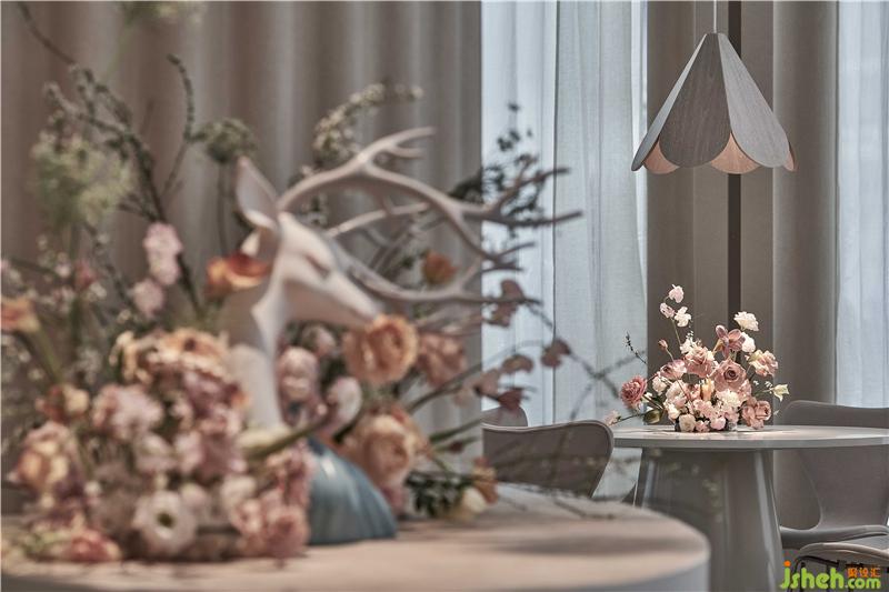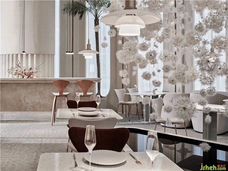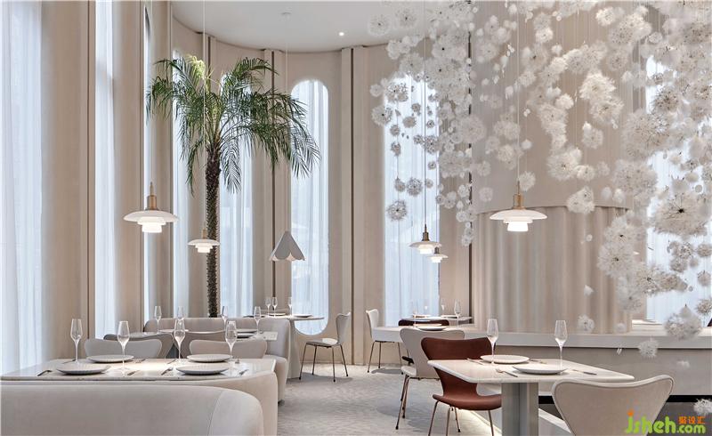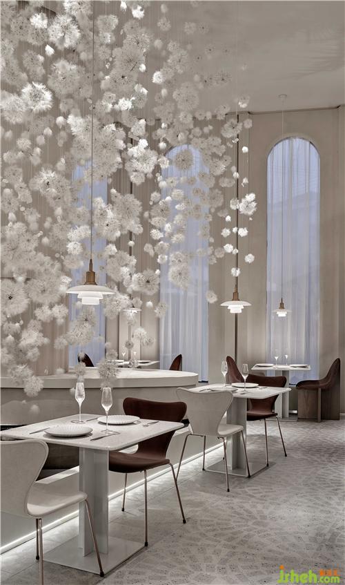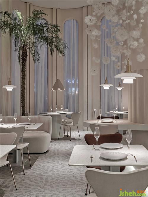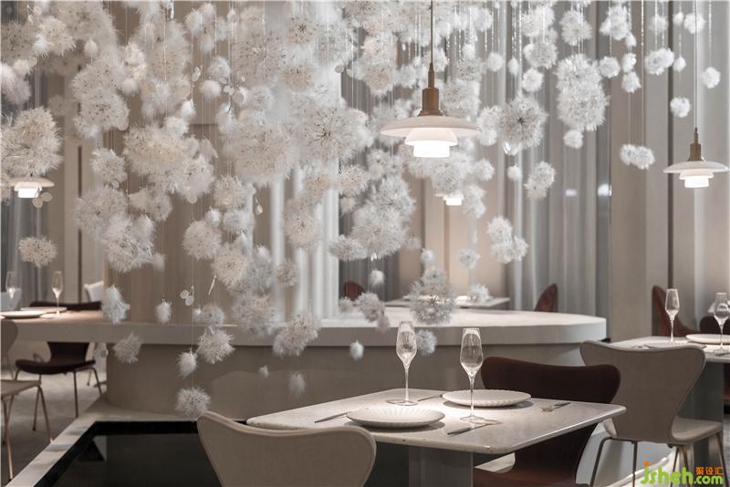 设计师从建筑师彼得·卒姆托提出的“custom-made architecture(客制建筑)”的理念,强调空间与在地环境相互融合,在整个内外立面的构造关系中,上海餐厅设计为了隐藏了原有建筑中存在的钢架结构外貌,设计师结合了上海法租界的历史建筑和当下建筑,重新整理有序,构造出拱形门窗的建筑形态,原本直白的光线通过拱形结构的影响,通过时间的变化而改变着光影进入室内的样貌,当人和光同时进入时,蒲公英又感知到风,摆动在空中时,光线、空间与人之间的对话,整个空间就充满了惊喜和满足。设计师把其中一面墙将花艺半嵌入墙体,用肌理涂料将其涂抹,将墙面的唯美与蒲公英装置形成静与动的有趣结合。