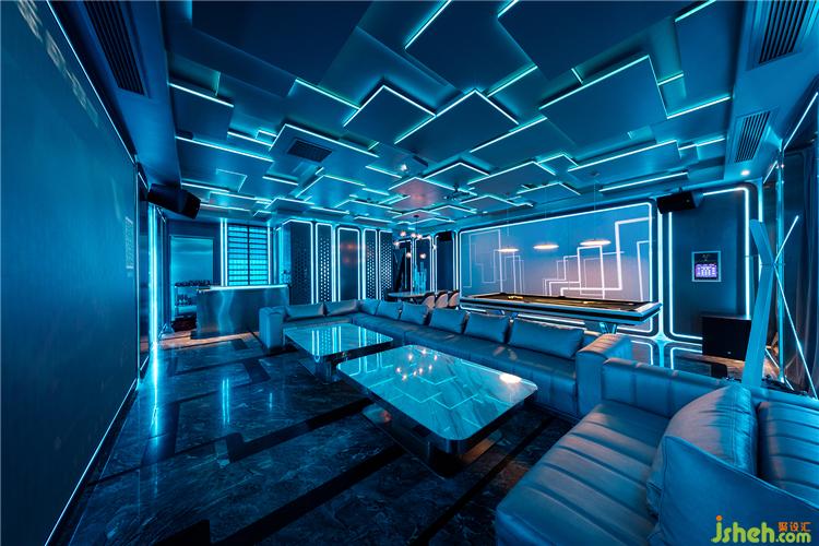 科技感十足的内嵌LED屏幕,在线条的“夹击”下,拓出自己的领地。蓝紫色弥散在空间,到了台球区,则通过吊灯增强照度。会所设计