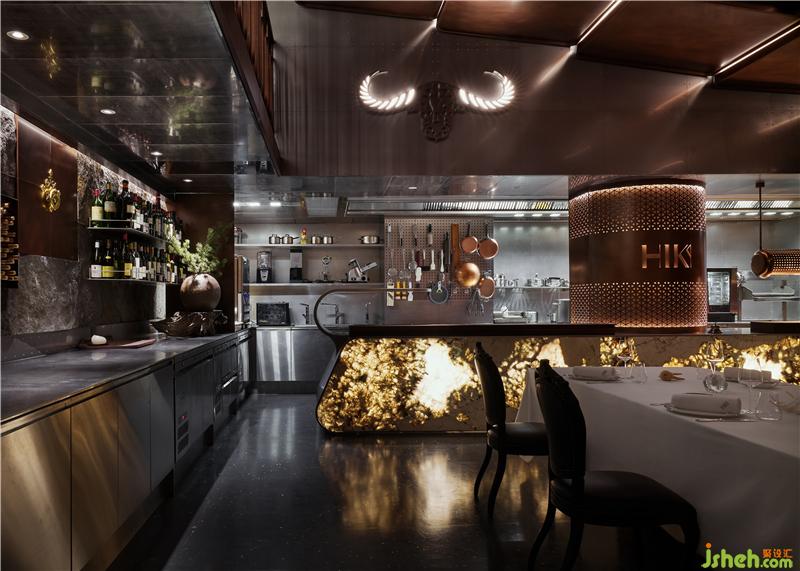 餐厅呈现出都市轻奢与工业复古的风格调性,空间中大量使用古铜及黑胡桃木,搭配泛光化的照明,给人温暖自然的感觉上海餐厅设计。餐厅拥有采用喜马拉雅岩盐制成的干式熟成室、开放的食材储存区,可以让客人能直观地欣赏和挑选食材。